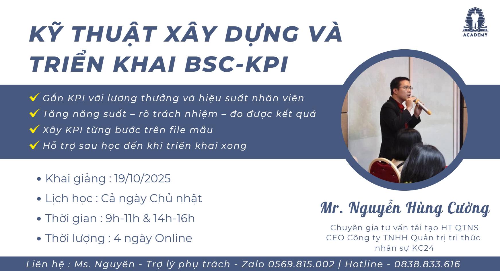 Hiệu suất không đo được = không thể quản lý. Đó là lý do KPI ra đời – nhưng liệu bạn đã biết cách xây đúng? Khóa học “Kỹ thuật xây dựng và triển khai BSCvsKPI G43” sẽ giúp bạn: