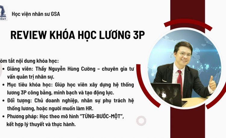 Nếu bạn đang tìm một khóa học bài bản, rất thực tiễn để triển khai hệ thống lương 3P — từ vị trí công việc (P1), người làm việc (P2) tới kết quả hiệu suất (P3) — thì khóa học của thầy Nguyễn Hùng Cường tại GSA là lựa chọn cực kỳ phù hợp. Nó không phải chỉ là lý thuyết, mà là hệ thống vận hành có thể triển khai ngay, giúp doanh nghiệp nâng cao năng lực nhân sự, minh bạch đãi ngộ và cải thiện hiệu suất.