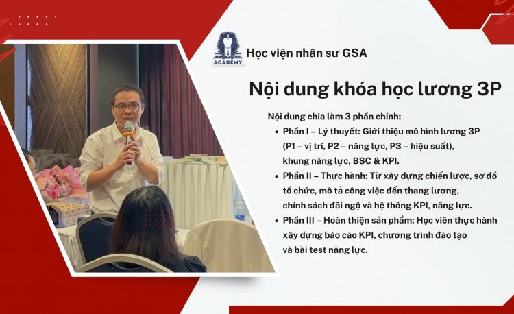 Nếu bạn đang tìm một từ khóa học giúp hiểu sâu và thực thi mô hình lương 3P – từ việc xác định vị trí, năng lực, đến hiệu suất công việc – thì khóa học của chuyên gia Nguyễn Hùng Cường tại Học viện Nhân sự GSA là lựa chọn bài bản và thực tiễn. Với nội dung rõ ràng, phương pháp “Từng-Bước-Một”, bạn sẽ không còn hoang mang “bắt đầu từ đâu”, mà có lộ trình phát triển khai rõ ràng để áp dụng ngay trong doanh nghiệp.