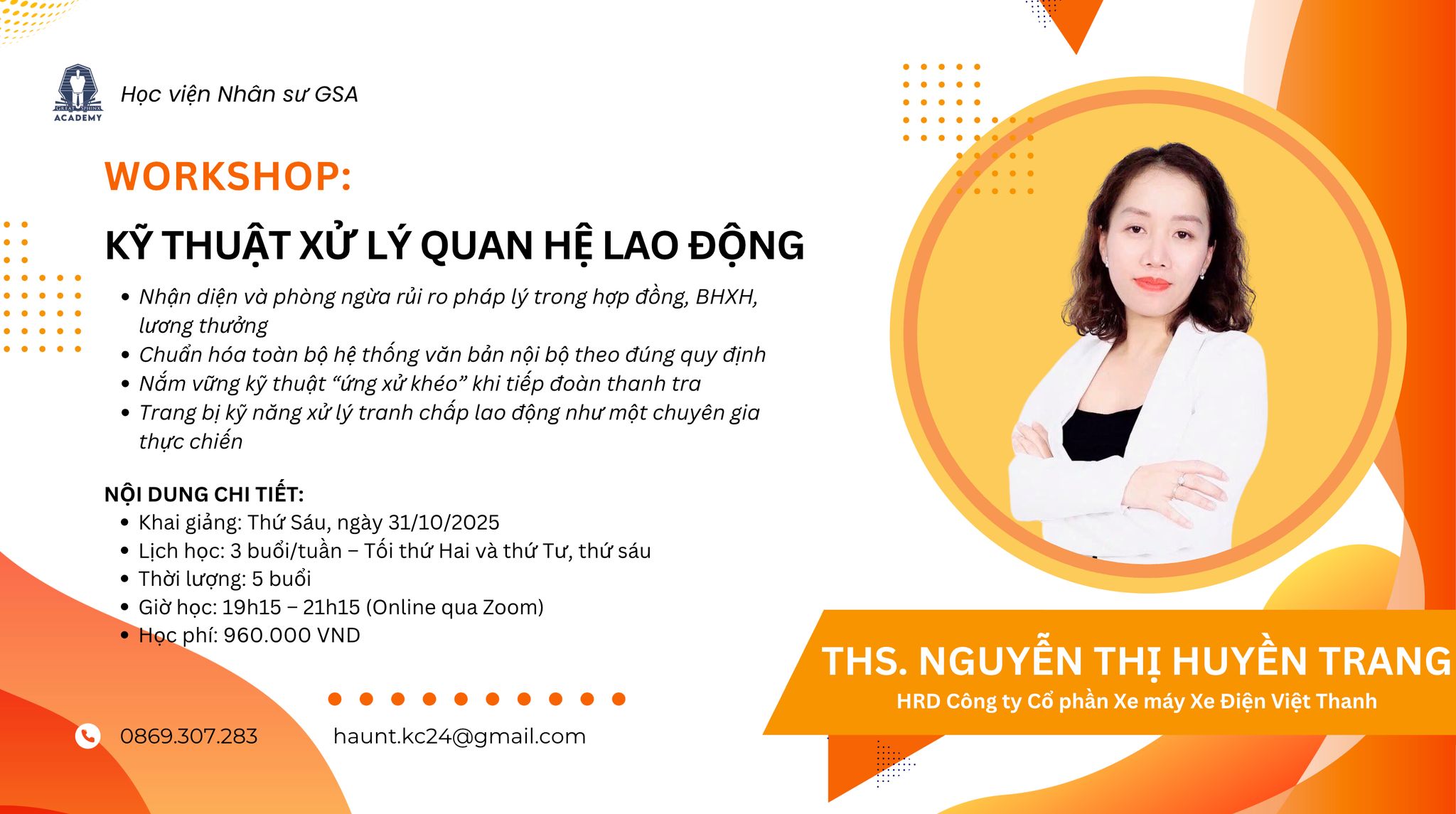 Để giúp HR chủ động phòng ngừa những rủi ro về luật lao động, những thủ tục pháp lý…, Học viện Nhân Sư GSA tổ chức Workshop “Kỹ thuật xử lý quan hệ lao động” – chương trình thực tiễn được dẫn dắt bởi ThS. Nguyễn Thị Huyền Trang, HRD Hệ thống Xe Điện Việt Thanh.