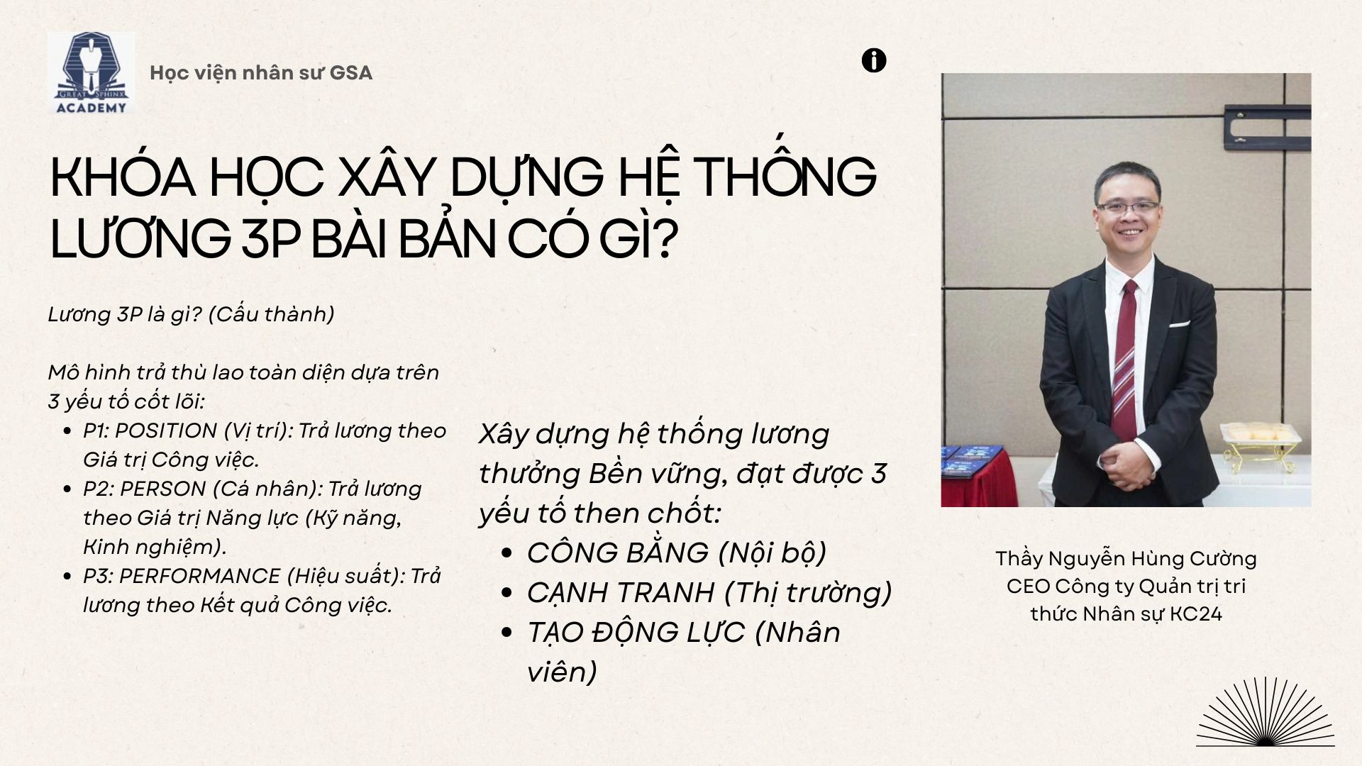 Lương 3P là phương pháp lương dựa trên ba yếu tố chính: Chức vụ (Vị trí), Người (Cá nhân) và Thành tích (Hiệu biểu). Khóa học của thầy Cường đi sâu vào từng chữ “P” để đảm bảo người học có thể áp dụng một cách bài bản: