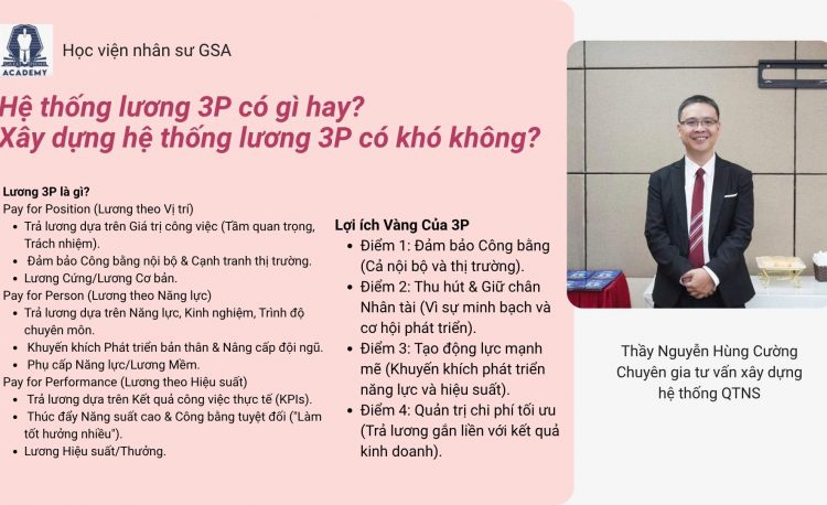 Hệ thống lương 3P (Pay for Place , Pay for Person , Pay for Performance ) đang trở thành mô hình quản trị lương tiền được nhiều doanh nghiệp Việt Nam, đặc biệt là các công ty quy mô từ 100 nhân viên trở lên, áp dụng. Đây không chỉ là một phương pháp trả lương mà còn là một công cụ quản trị nhân sự hiện đại nhắm giải quyết bài toán trẻ tuổi về sự công bằng, thu hút và giữ chân nhân tài .