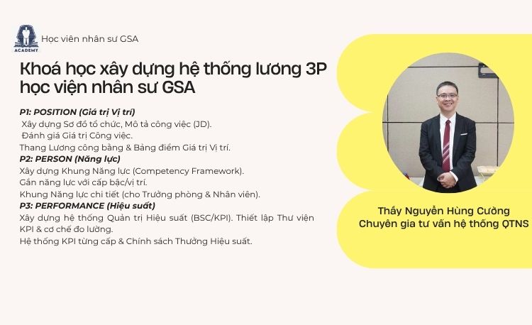 Trong khung cảnh thị trường lao động ngày càng cạnh tranh và yêu cầu về sự minh bạch, công bằng trong đãi ngộ ngày càng cao, Hệ thống Lương 3P đã trở thành “chìa khóa vàng” giúp các doanh nghiệp Việt Nam giữ chân nhân tài và tối ưu hóa hiệu suất làm việc. Khóa học chuyên sâu “Lương 3P – Kỹ thuật triển khai và xây dựng hệ thống” tại Học viện Nhân sư GSA (daotaonhansu.net/luong3p) do ThS. Nguyễn Hùng Cường , CEO Công ty Quản trị Tri thức Nhân sự KC24, trực tiếp giảng dạy.