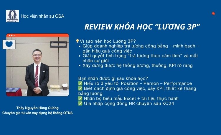 Nếu bạn là chủ doanh nghiệp, trưởng phòng nhân sự, hay đơn giản là người muốn hiểu và áp dụng đúng phương pháp lương 3P, thì khóa học tại daotaonhansu.net/luong3p của Thầy Nguyễn Hùng Cường – Công ty KC24 chính là sự lựa chọn đáng đầu tư.
