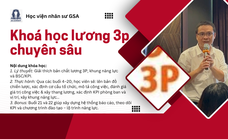 Khóa học Chuyên sâu 3P – Kỹ thuật triển khai và xây dựng hệ thống lương 3P do Giảng viên Nguyễn Hùng Cường chuyên gia tư vấn xây dựng hệ thống quản trị nhân sự – giảng dạy tại Học viện Nhân sư GSA là giải pháp toàn diện, chuyên biệt dành cho chủ doanh nghiệp, nhân sự hoặc ai “muốn làm HR” nhưng chưa biết bắt đầu từ đâu.