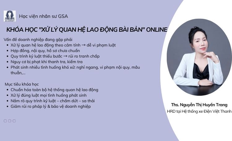 Khóa học “Kỹ thuật xử lý quan hệ lao động bài bản” là lựa chọn cần thiết cho bất kỳ doanh nghiệp nào muốn vận hành an toàn – chuyên nghiệp – tuân thủ pháp luật, đặc biệt trong bối cảnh thị trường lao động đang thay đổi nhanh chóng.