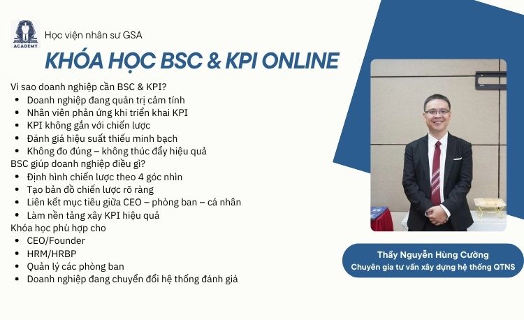 Khóa học BSC & KPI online của Học viện nhân sư GSA cung cấp quy trình triển khai đầy đủ, giúp CEO hiểu cốt lõi, tránh sai lầm và áp dụng đúng chuẩn, phù hợp mọi loại hình doanh nghiệp.