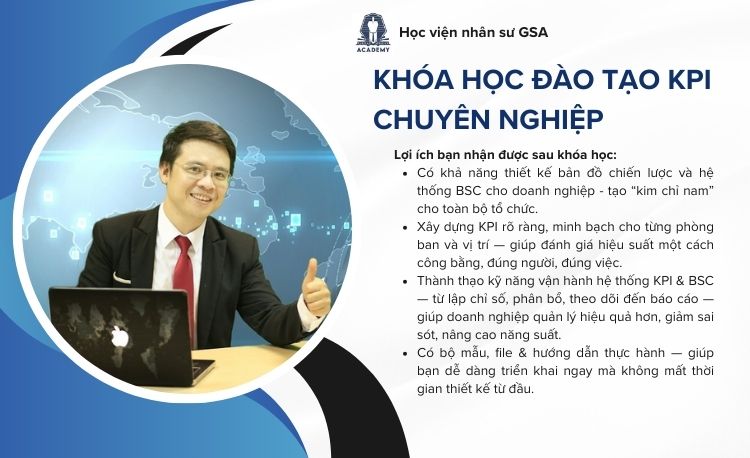 Nếu bạn đang tìm một giải pháp đào tạo KPI một cách bài bản, chuyên nghiệp — không chỉ học lý thuyết mà thực sự biết cách ứng dụng KPIs và BSC trong doanh nghiệp — thì khóa học của Học viện Nhân sự GSA là lựa chọn rất đáng cân nhắc. Với lộ trình rõ ràng, nội dung thực tiễn và linh hoạt cho người đi làm, khóa học giúp bạn từ người chưa biết gì về KPI trở thành người có khả năng xây dựng hệ thống đo lường hiệu suất chuyên nghiệp, giúp doanh nghiệp vận hành hiệu quả và phát triển bền vững.