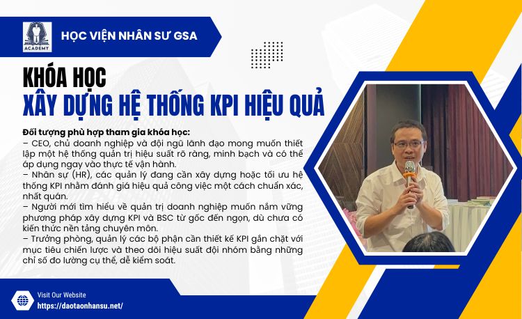 Trong bối cảnh cạnh tranh ngày càng khốc liệt, việc doanh nghiệp có một hệ thống quản trị hiệu suất rõ ràng là yếu tố sống còn. Khóa học “BSC & KPI – kỹ thuật xây dựng và triển khai” do Nguyễn Hùng Cường chuyên gia tư vấn xây dựng hệ thống quản trị nhân sự – giảng dạy tại Học viện Nhân sư GSA chính là giải pháp tối ưu, giúp doanh nghiệp dù lớn hay nhỏ, dù chưa có nền tảng nhân sự bài bản, cũng có thể xây dựng hệ thống KPI – BSC một cách hiệu quả và thực tiễn.