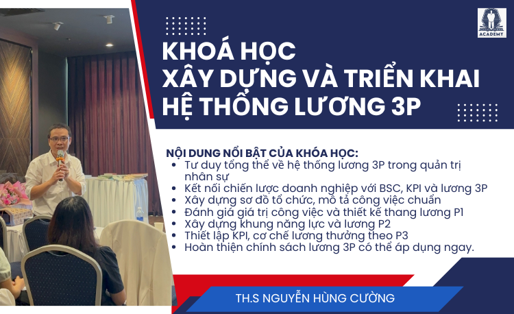 Trong bối cảnh doanh nghiệp ngày càng chú trọng đến hiệu suất và sự công bằng trong đãi ngộ, hệ thống lương 3P (Position – Person – Performance) đã trở thành xu hướng quản trị nhân sự hiện đại. Khóa học xây dựng và triển khai hệ thống lương 3P của thầy Nguyễn Hùng Cường chuyên gia tư vấn xây dựng hệ thống quản trị nhân sự – giảng dạy tại Học viện Nhân sư GSA, được thiết kế nhằm giúp doanh nghiệp và người làm HR tự tay xây dựng một hệ thống lương bài bản, minh bạch và bền vững.