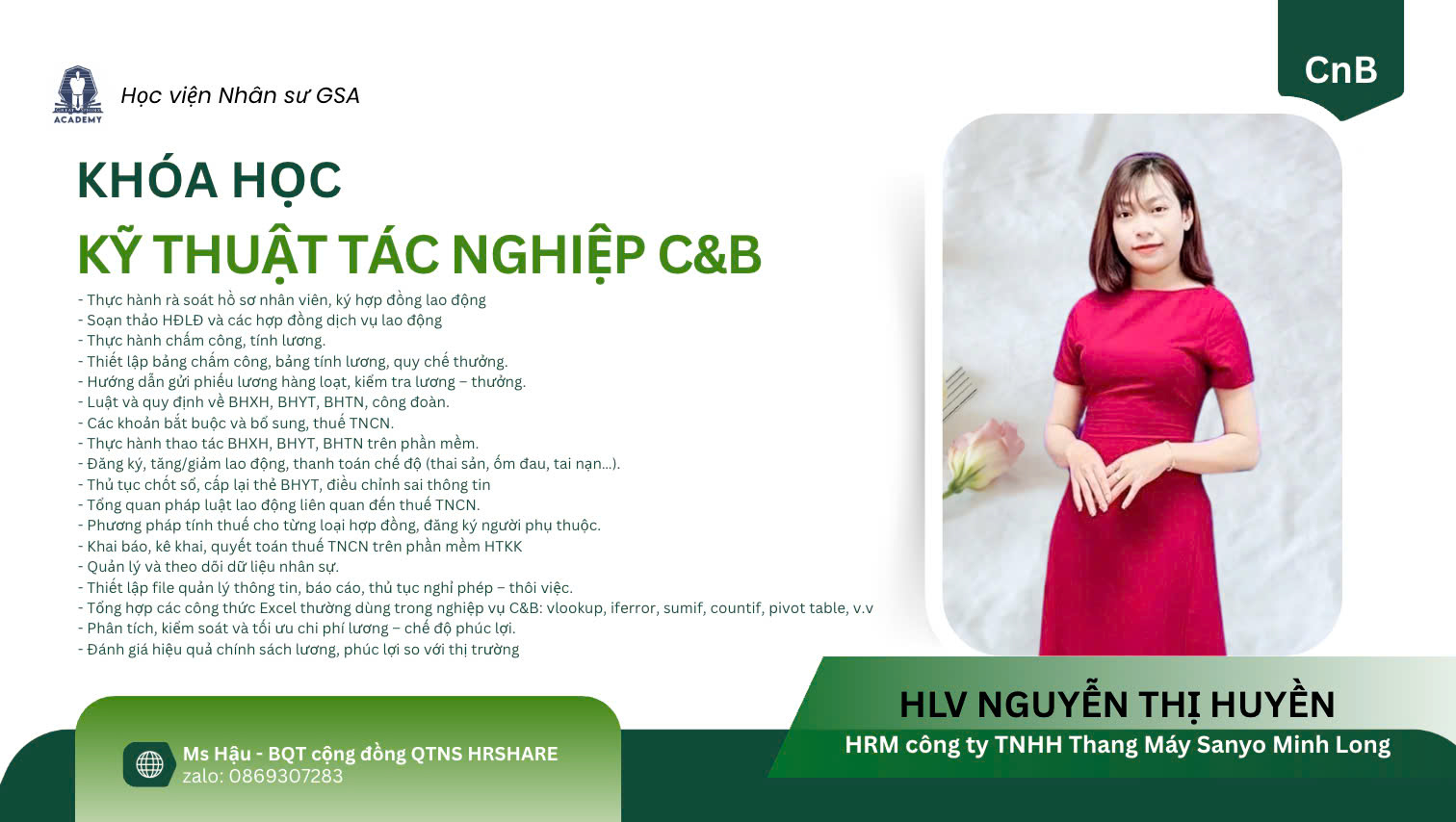 Khóa học do Ms. Nguyễn Thị Huyền – HRM Công ty TNHH Thang máy Sanyo Minh Long trực tiếp giảng dạy. Với hơn 12 năm kinh nghiệm trong lĩnh vực nhân sự, đặc biệt là mảng C&B và vận hành hệ thống nhân sự, giảng viên mang đến phương pháp giảng dạy dễ hiểu, sát thực tế và có khả năng áp dụng ngay vào công việc.