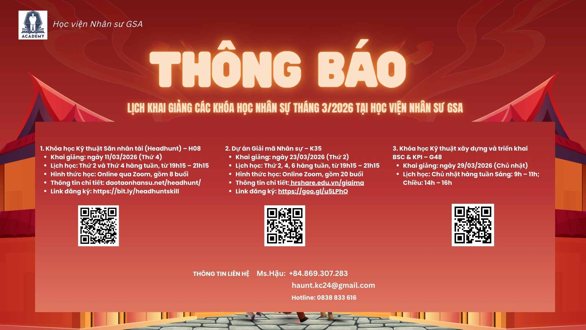 Tháng 03/2026, Học viện Nhân sự GSA chính thức công bố lịch khai giảng các khóa học chuyên sâu dành cho cộng đồng Nhân sự và nhà quản lý doanh nghiệp. Với định hướng đào tạo bài bản – thực tiễn – dễ áp dụng, các chương trình của GSA được thiết kế phù hợp cho nhiều cấp độ: từ người mới vào nghề HR, HR trái ngành cho tới HRM, HRBP và CEO doanh nghiệp vừa và nhỏ.