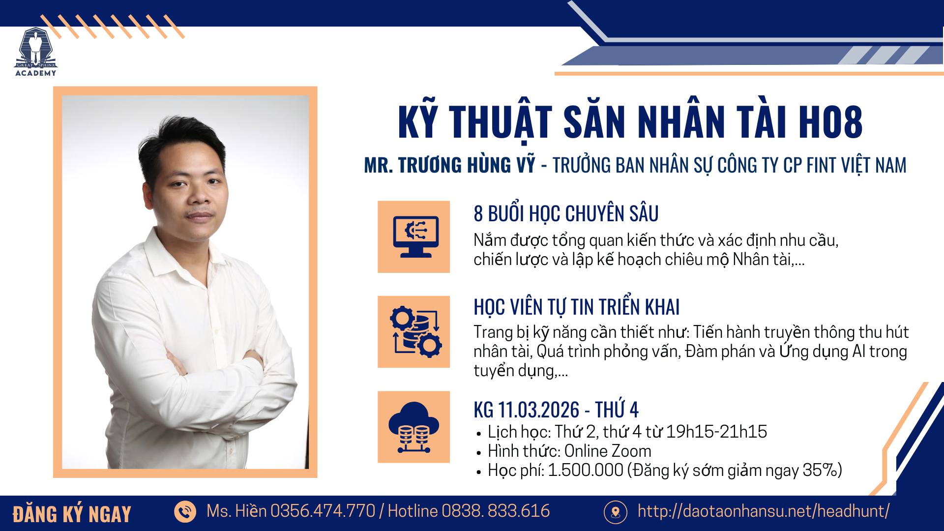 Workshop “Kỹ thuật Săn Nhân Tài – Headhunt H08” khai giảng ngày 11/03/2026, học online qua Zoom vào tối thứ 2 và thứ 4 hàng tuần. Chương trình được trực tiếp hướng dẫn bởi Mr. Trương Hùng Vỹ – Trưởng ban Nhân sự Công ty Cổ phần Fint Việt Nam, với mức học phí 1.500.000 đồng và ưu đãi giảm 35% cho học viên đăng ký sớm.